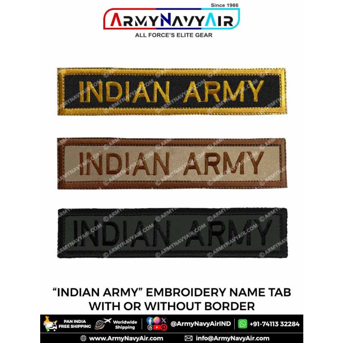 Buy INDIAN ARMY Name Tab Embroidery : ArmyNavyAir.com from ArmyNavyAir – premium gear trusted by NCC, Scouts & Defence personnel across India. Established 1986.